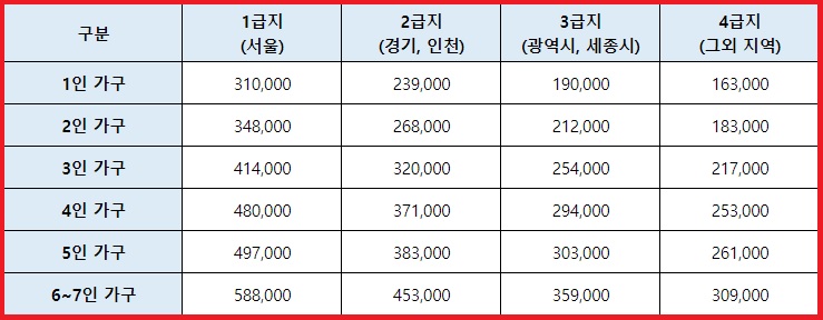 구성원에 따라 1인 가구부터 5인 가구까지 구분하며, 가구원들의 기준금액은 위와 같습니다.