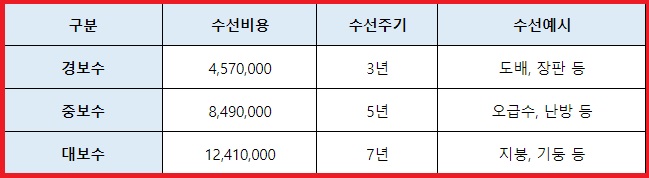 도배, 난방, 지붕 수리 등과 같은 비용 신청이 가능하며, 노후 정도에 따라 경보수, 중보수, 대보수로 구분하여 비용이 지급되며, 수선 주기는 보수 정도에 따라 3년, 5년, 7년마다 재신청이 가능합니다.